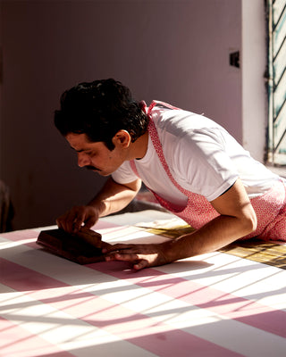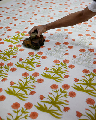 Individual and intricately carved blocks are used to print each colour within a design. The pattern comes to life as the printer works his way along the table, block by block.