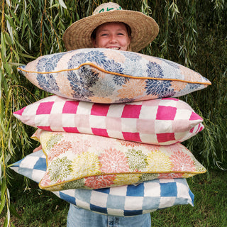In this new collection Molly continues to celebrate the dynamic colour range that surrounds her life, pink saried ladies in India, sap greens in the forest, blue skies and of course, all the wonderful colour palette of a bed of Dahlias.