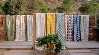 Hand block printed on Molly Mahon’s new 30% Bamboo and 70% Cotton herringbone woven cloth in two colourways of Brown and Sky Blue and hand block printed on plain 50% Bamboo, 25% Cotton, 25% Linen cloth in Olive.
