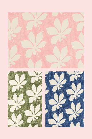 The classic horse chestnut leaf has been captured as a block print with its hand like patterned leaf set against a coloured ground that evokes memories of the leaves falling through and the smell of roasted chestnuts.
