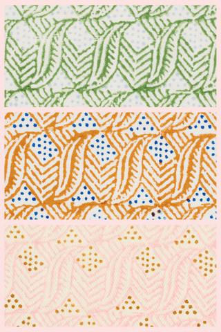 Available in three colourways, hand block printed on Molly’s new 88% Recycled Cotton & 12% Bamboo cloth in Olive and Navy and hand block printed on Molly Mahon’s new 30% Bamboo and 70% Cotton herringbone woven cloth in Pink.